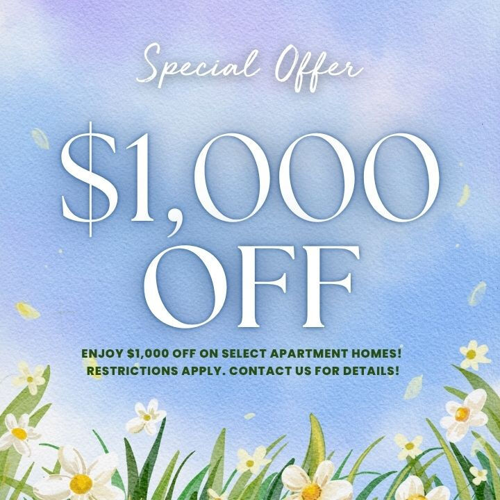 Enjoy a $1,000 Move In Discount on Select Apartment Homes! Restrictions Apply. Contact Us for Details!